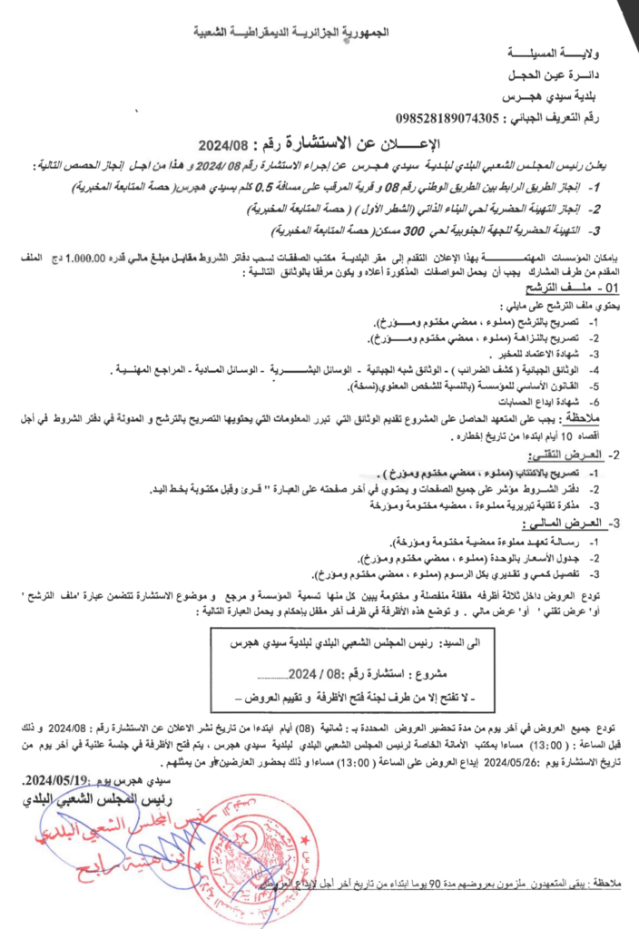 إعلان عن استشارة 2024/08 بلدية سيدي هجرس
