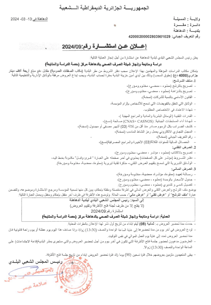 استشارة من أجل انجاز العملية التالية: دراسة ومتابعة وانجاز شبكة الصرف الصحي بالدهاهنة مركز (حصة الدراسة والمتابعة)13 مارس، 20240 22 شاركها فيسبوك X مشاركة عبر البريد طباعة