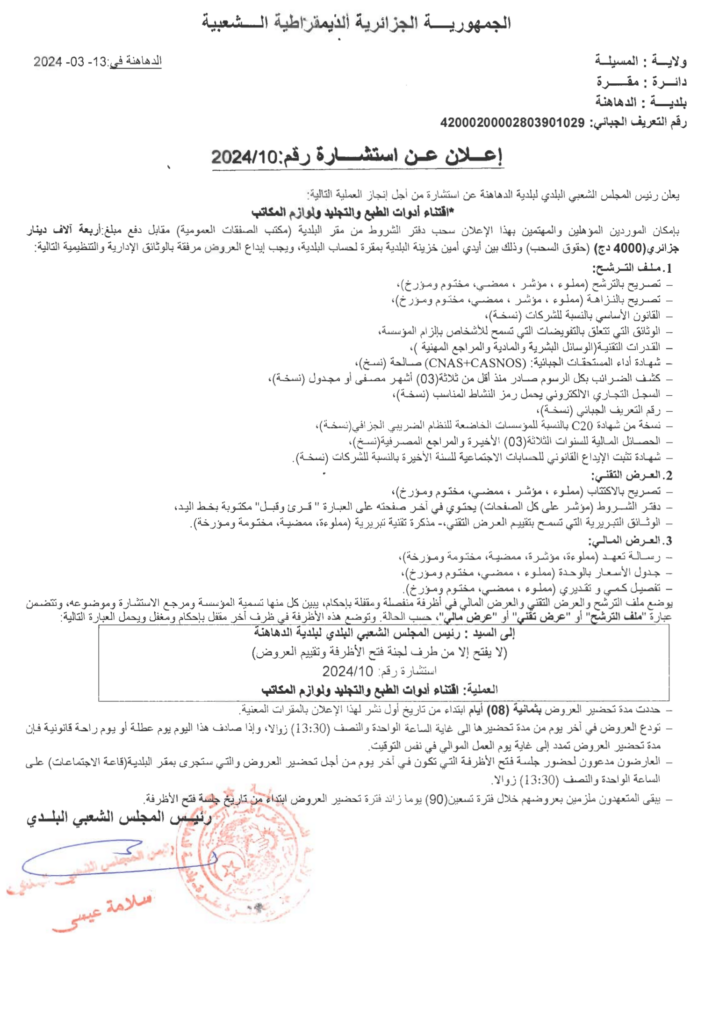 استشارة من أجل انجاز العملية التالية: اقتناء أدوات الطبع والتجليد ولوازم المكاتب13 مارس، 20240 15 شاركها فيسبوك X مشاركة عبر البريد طباعة