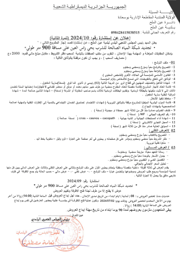استشارة من أجل: تجديد شبكة المياه الصالحة للشرب بحي راس العين على مسافة 900 متر طولي26 يونيو، 20240 7 شاركها فيسبوك X مشاركة عبر البريد طباعة