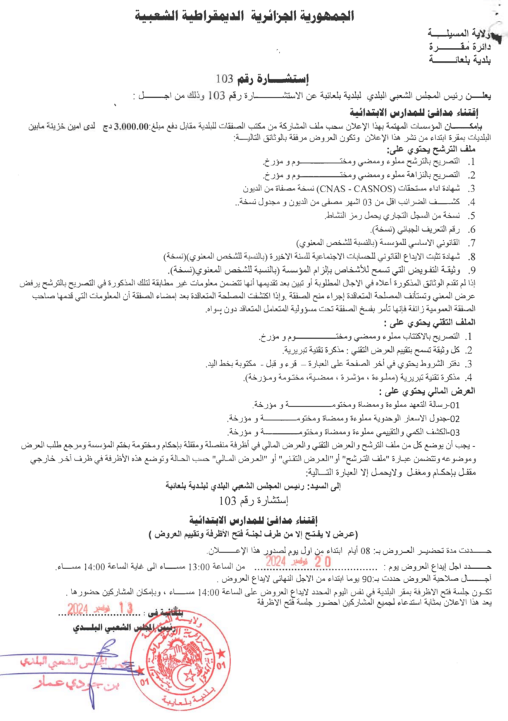 استشارة من أجل: اقتناء مدافئ للمدارس الابتدائية14 نوفمبر، 20240 4 شاركها فيسبوك X مشاركة عبر البريد طباعة