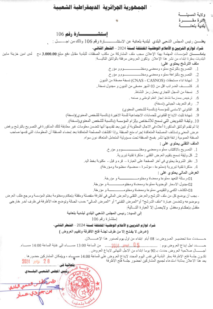 استشارة من أجل: شراء لوازم التزيين والأعلام الوطنية المختلفة لسنة 2024 -الشطر الثاني-2 ديسمبر، 20240 6 شاركها فيسبوك X مشاركة عبر البريد طباعة