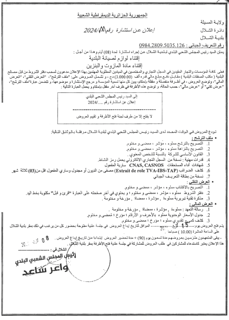 استشارة من أجل: إقتناء لوازم لصيانة البلدية، إقتناء مادة المازوت والبنزين14 أبريل، 20240 26 شاركها فيسبوك X مشاركة عبر البريد طباعة