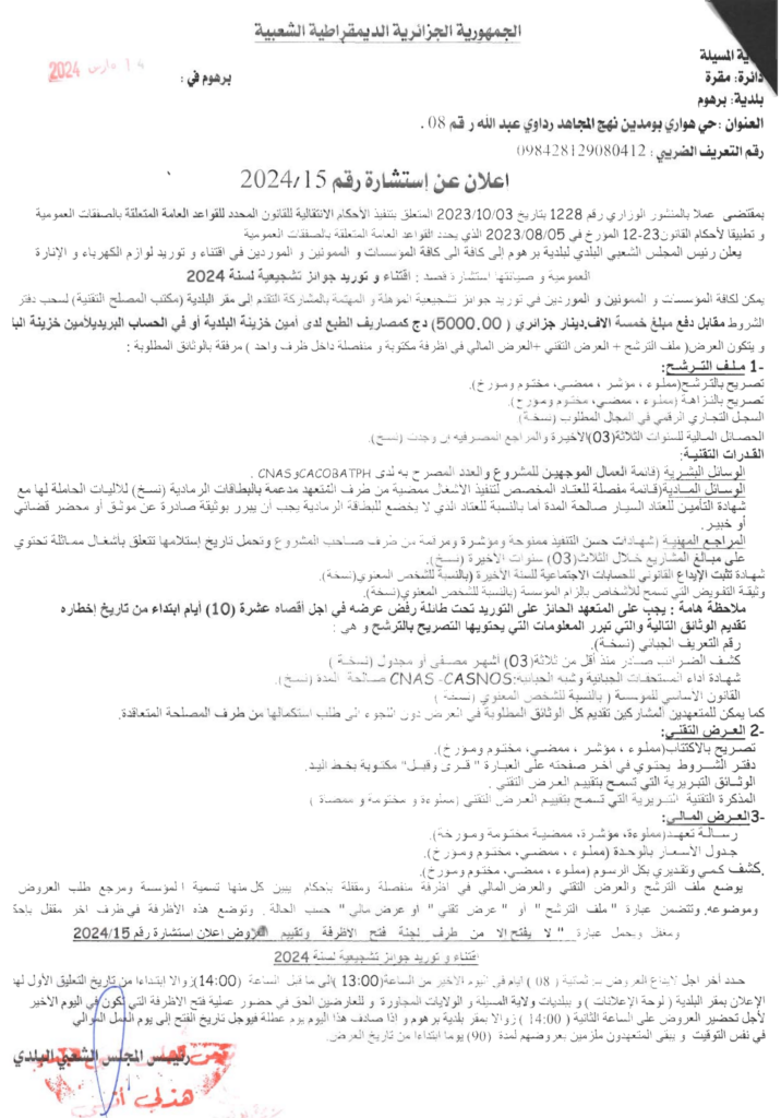 استشارة من أجل: اقتناء وتوريد جوائز تشجيعية لسنة 2024 بلدية برهوم17 مارس، 20240 6 شاركها فيسبوك X مشاركة عبر البريد طباعة