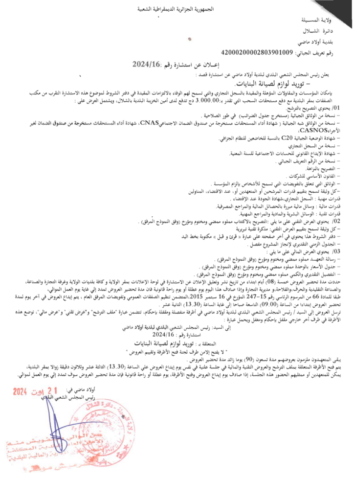 استشارة من أجل: توريد لوازم لصيانة البنايات21 أغسطس، 20240 3 شاركها فيسبوك X مشاركة عبر البريد طباعة