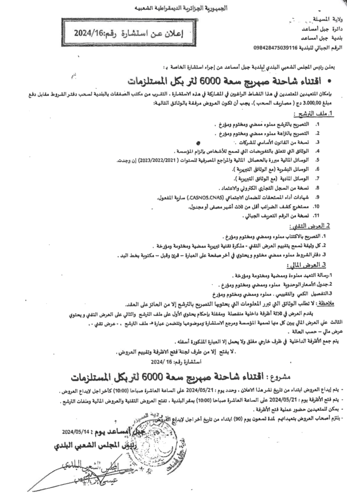 استشارة من أجل: اقتناء شاحن صهريج سعة 6000 لتر بكل المستلزمات20 مايو، 20240 4 شاركها فيسبوك X مشاركة عبر البريد طباعة