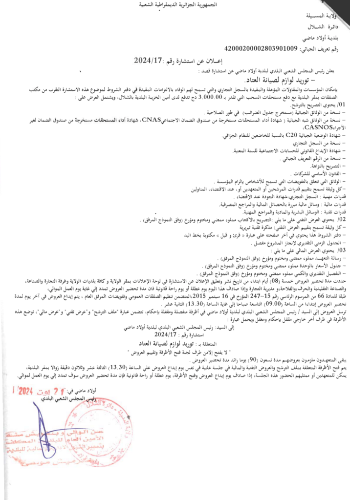 استشارة من أجل: توريد لوازم لصيانة العتاد
