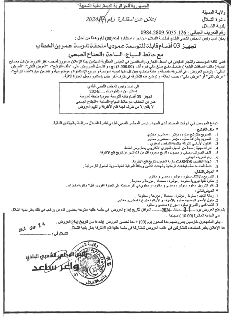 استشارة من أجل: تجهيز 03 أقسام قابلة للتوسعة عموديا ملحقة لمدرسة عمر بن الخطاب مع حائط السياج + الساحة + الجناح الصحي26 يونيو، 20240 3 شاركها فيسبوك X مشاركة عبر البريد طباعة