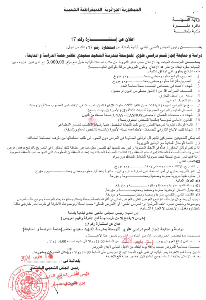 استشارة من أجل: دراسة ومتابعة انجاز قسم دراسي علوي للتوسعة بمدرسة الشهيد سعيدي لخضر17 مارس، 20240 40 شاركها فيسبوك X مشاركة عبر البريد طباعة