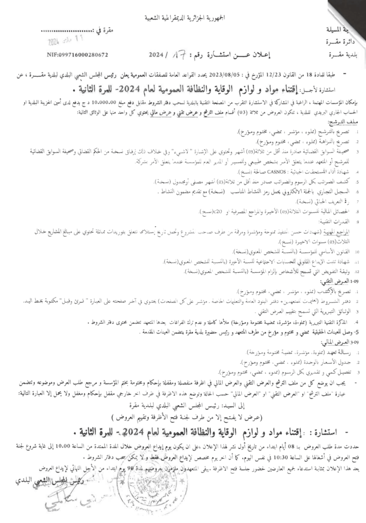 استشارة من أجل: اقتناء مواد ولوازم الوقاية والنظافة العمومية لعام 2024 -للمرة الثانية-12 مارس، 20240 11 شاركها فيسبوك X مشاركة عبر البريد طباعة