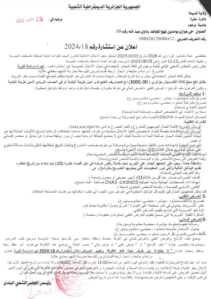 استشارة من أجل اجراء دراسة التربة لمشروع: دراسة ومتابعة وإنجاز 04 أقسام تدريس للتوسعة بمدرسة الشهيد سعادي علاوة25 مارس، 20240 3 شاركها فيسبوك X مشاركة عبر البريد طباعة