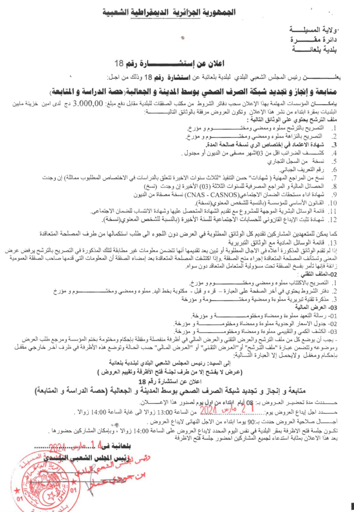 استشارة من أجل: متابعة وانجاز وتجيد شبكة الصرف الصحي بوسط المدينة والجعالبة17 مارس، 20240 30 شاركها فيسبوك X مشاركة عبر البريد طباعة
