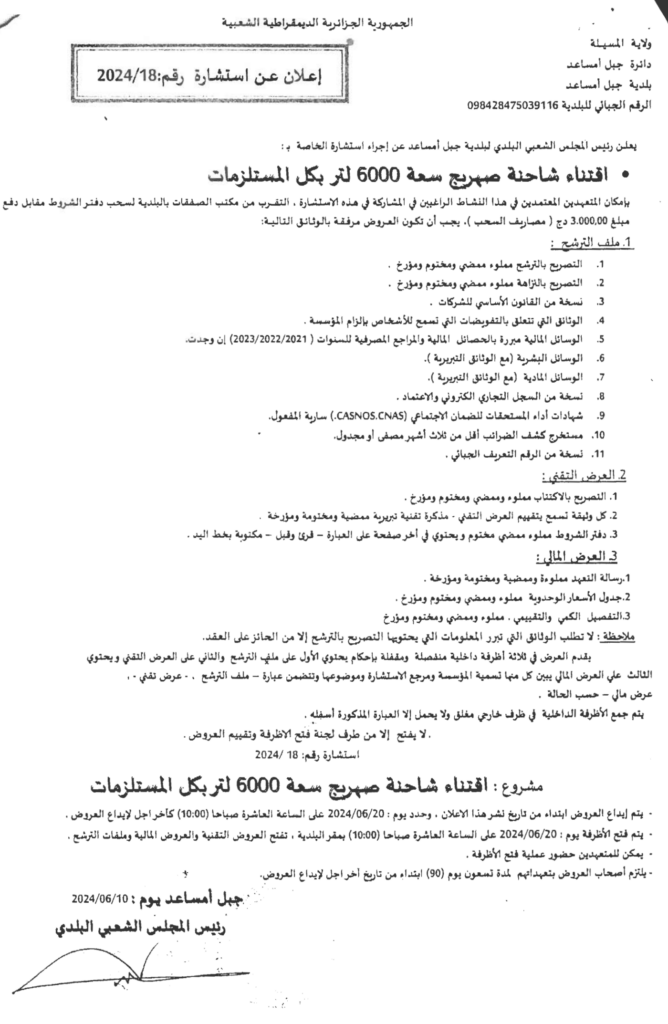 استشارة خاصة بـ : اقتناء شاحنة صهريج سعة 600 ل بكل المستلزمات19 يونيو، 20240 28 شاركها فيسبوك X مشاركة عبر البريد طباعة