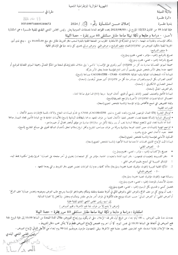 استشارة من أجل: دراسة ومتابعة وتكملة تهيئة ساحة مقابل مستشفى 60 سرير بمقرة25 مارس، 20240 28 شاركها فيسبوك X مشاركة عبر البريد طباعة