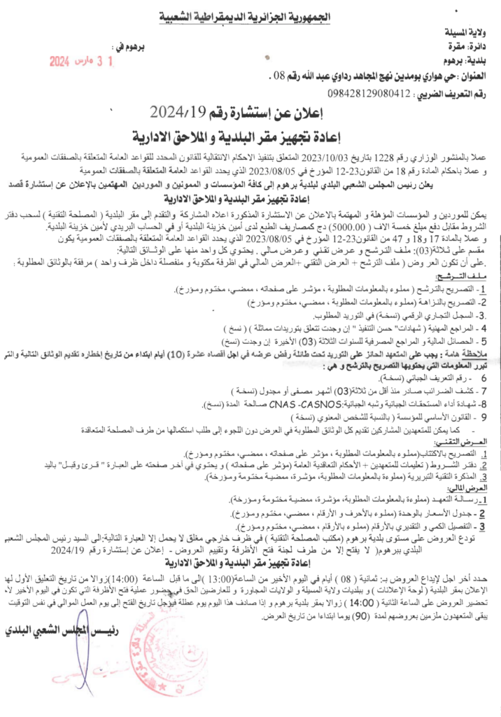 استشارة من أجل:إعادة تجهيز مقر البلدية والملاحق الادارية2 أبريل، 20240 43 شاركها فيسبوك X مشاركة عبر البريد طباعة