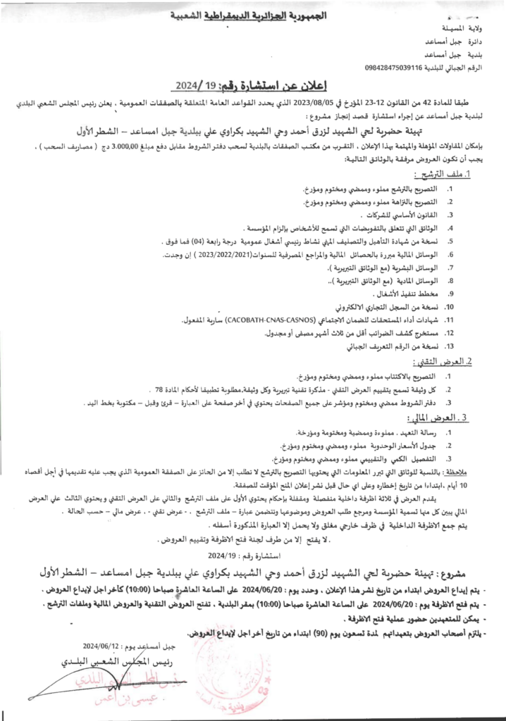 استشارة من أجل انجاز المشروع: تهية حضرية لحي الشهيد لزرق أحمد وحي الشهيد بكراوي على19 يونيو، 20240 27 شاركها فيسبوك X مشاركة عبر البريد طباعة
