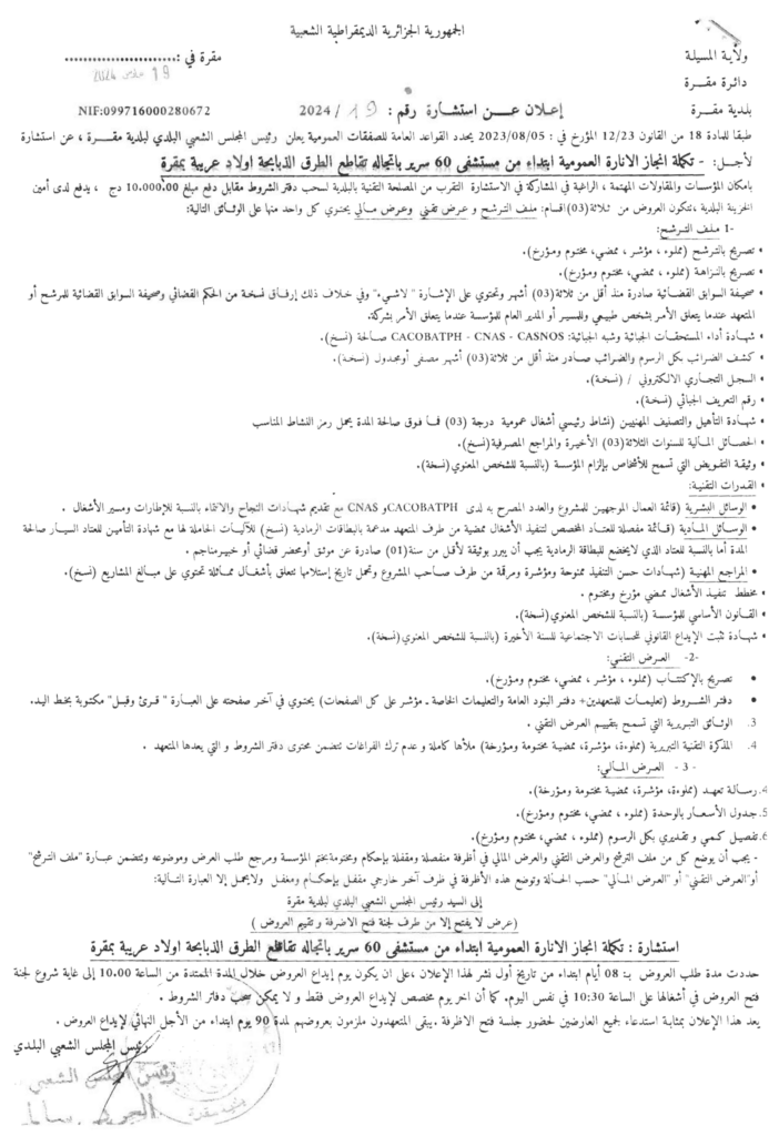 استشارة من أجل: تكملة انجاز الانارة العمومية ابتداء من مستشفى 60 سرير باتجاه تقاطع الطرق الذبابحة أولاد عربية25 مارس، 20240 16 شاركها فيسبوك X مشاركة عبر البريد طباعة