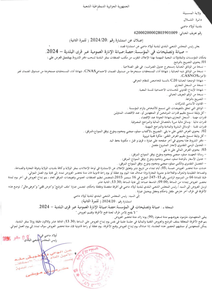 استشارة من أجل: صيانة وتصليحات في المؤسسة حصة صيانة الإنارة العمومية عبر قبى البلدية 202410 سبتمبر، 20240 32 شاركها فيسبوك X مشاركة عبر البريد طباعة