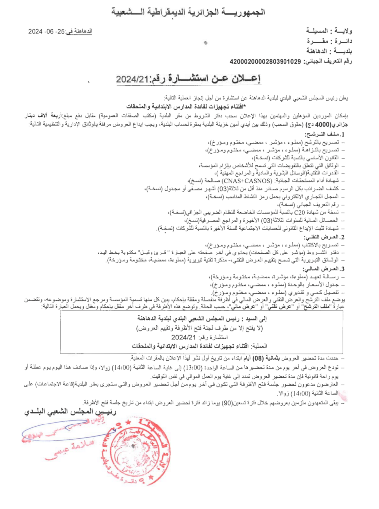 استشارة من أجل: اقتناء تجهيزات لفائدة المدارس الابتدائية والملحقات27 يونيو، 20240 2 شاركها فيسبوك X مشاركة عبر البريد طباعة