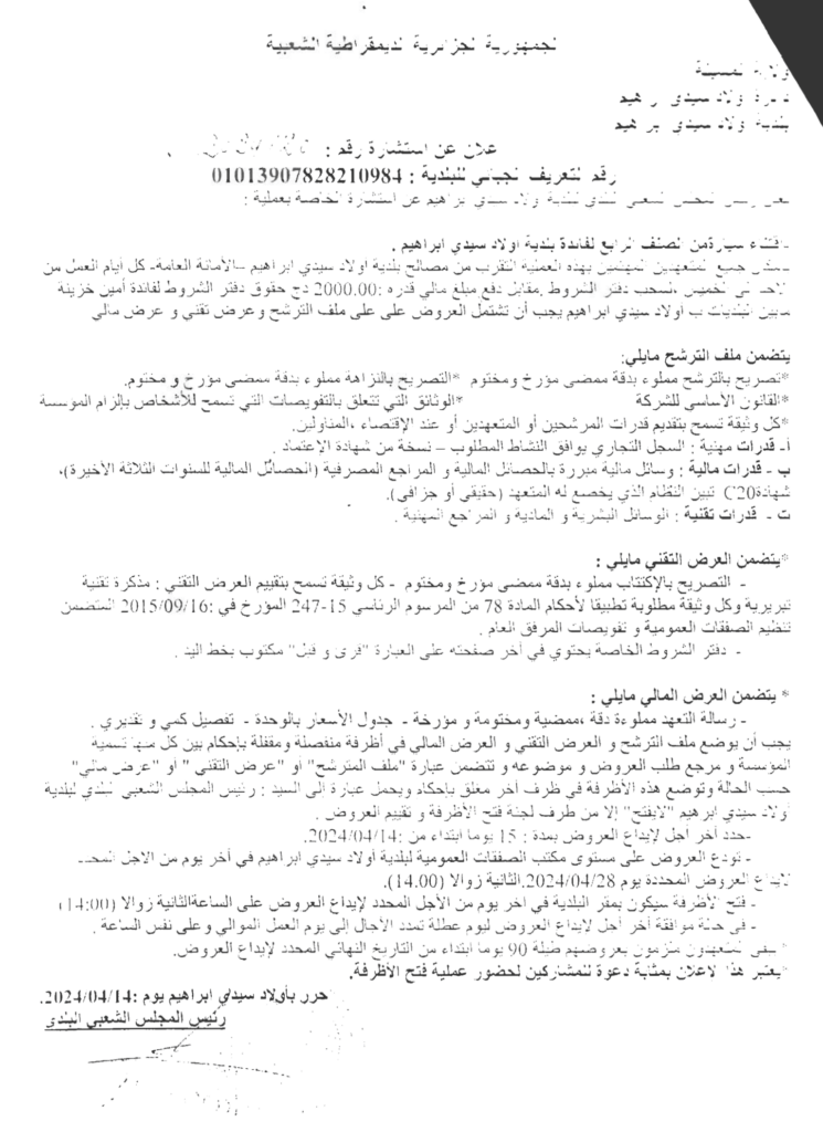 استشارة من أجل: اقتناء سيارة من الصنف 4 لفائدة البلدية21 أبريل، 20240 33 شاركها فيسبوك X مشاركة عبر البريد طباعة