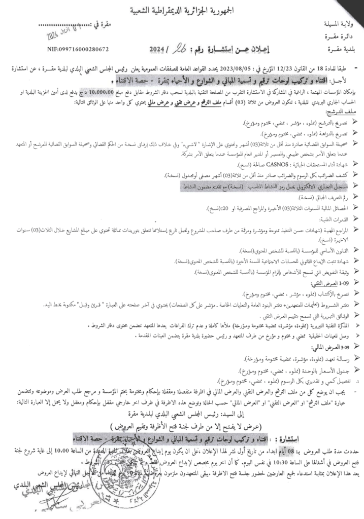 استشارة من أجل: اقتناء وتركيب لوحات ترقيم وتسمية المباني والشوارع والأحياء بمقرة2 أبريل، 20240 25 شاركها فيسبوك X مشاركة عبر البريد طباعة