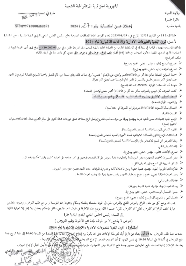استشارة من أجل: تموين البلدية بالمطبوعات الادارية واللافتات الاشهارية لعام 20242 أبريل، 20240 19 شاركها فيسبوك X مشاركة عبر البريد طباعة