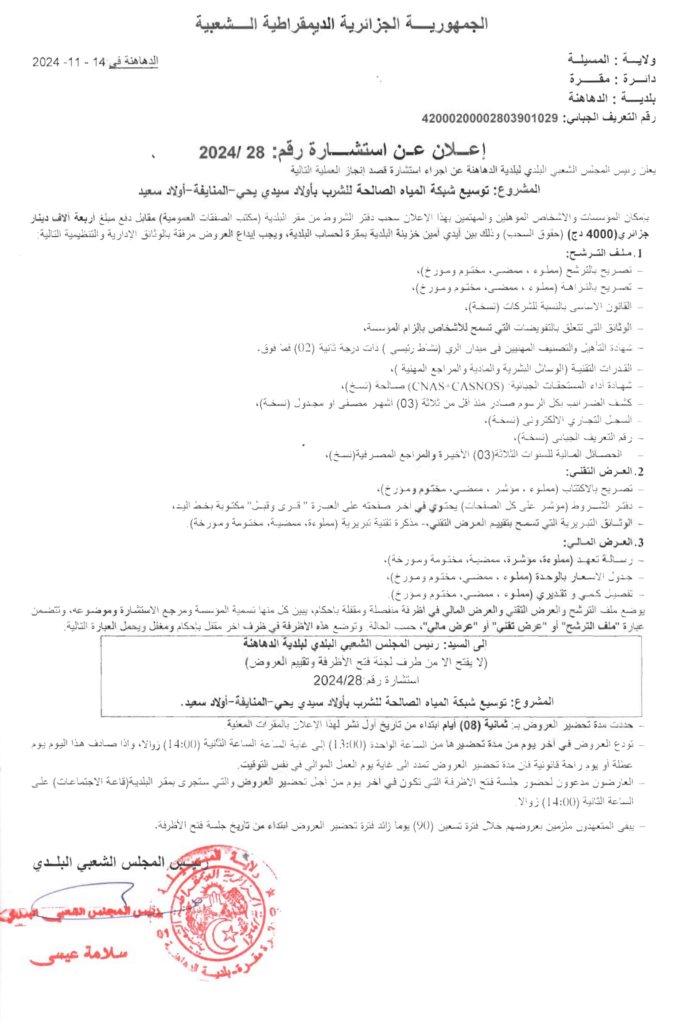 استشارة من أجل: توسيع شبكة المياه الصالحة للشرب بأولاد سيدي يحي -المنايفة – أولاد سعيد17 نوفمبر، 20240 4 شاركها فيسبوك X مشاركة عبر البريد طباعة