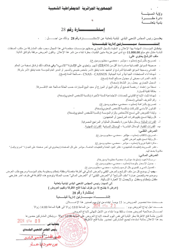 استشارة من أجل: اقتناء سيارتين ادارية للبلدية9 مايو، 20240 0 شاركها فيسبوك X مشاركة عبر البريد طباعة