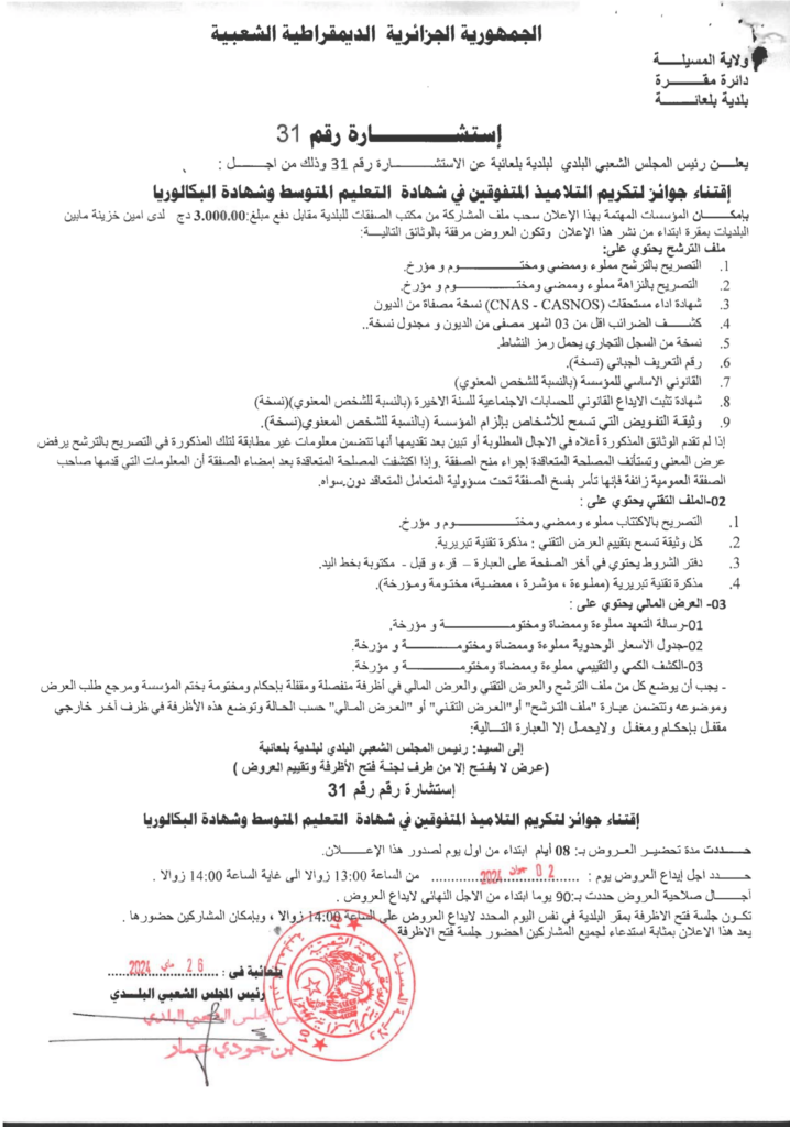 استشارة من أجل: إقتناء جوائز لتكريم التلاميذ المتوفقين في شهادة التعليم المتوسط وشهادة البكالوريا27 مايو، 20240 17 شاركها فيسبوك X مشاركة عبر البريد طباعة