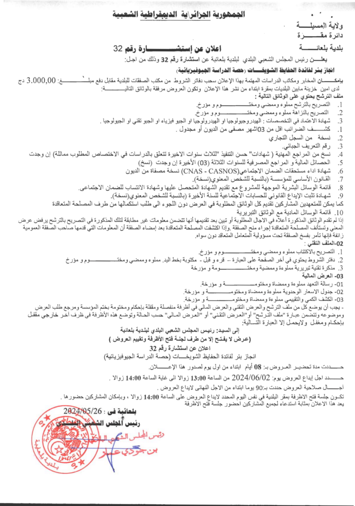 استشارة من أجل: انجاز بئر لفائدة الحفايظ الشويخات (حصة الدراسة الجيوفيزائية)27 مايو، 20240 10 شاركها فيسبوك X مشاركة عبر البريد طباعة
