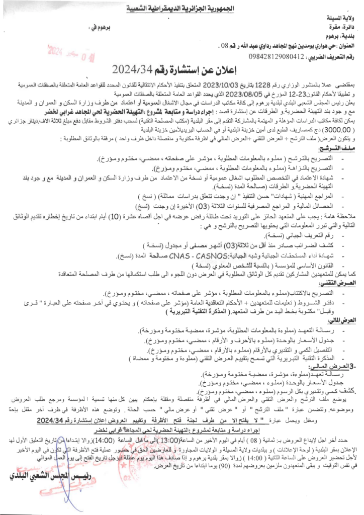 استشارة من أجل: اجراء دراسة ومتابعة لمشروع التهيئة الحضرية لحي المجاهد غرابي لخضر8 سبتمبر، 20240 7 شاركها فيسبوك X مشاركة عبر البريد طباعة
