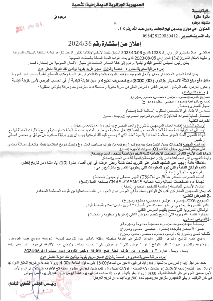 استشارة من أجل: اجراء مراقبة مخبرية لمشروع الحصة رقم 02 انجاز طريق بقرية لوقالين لفك العزلة الشطر الأول8 سبتمبر، 20240 5 شاركها فيسبوك X مشاركة عبر البريد طباعة