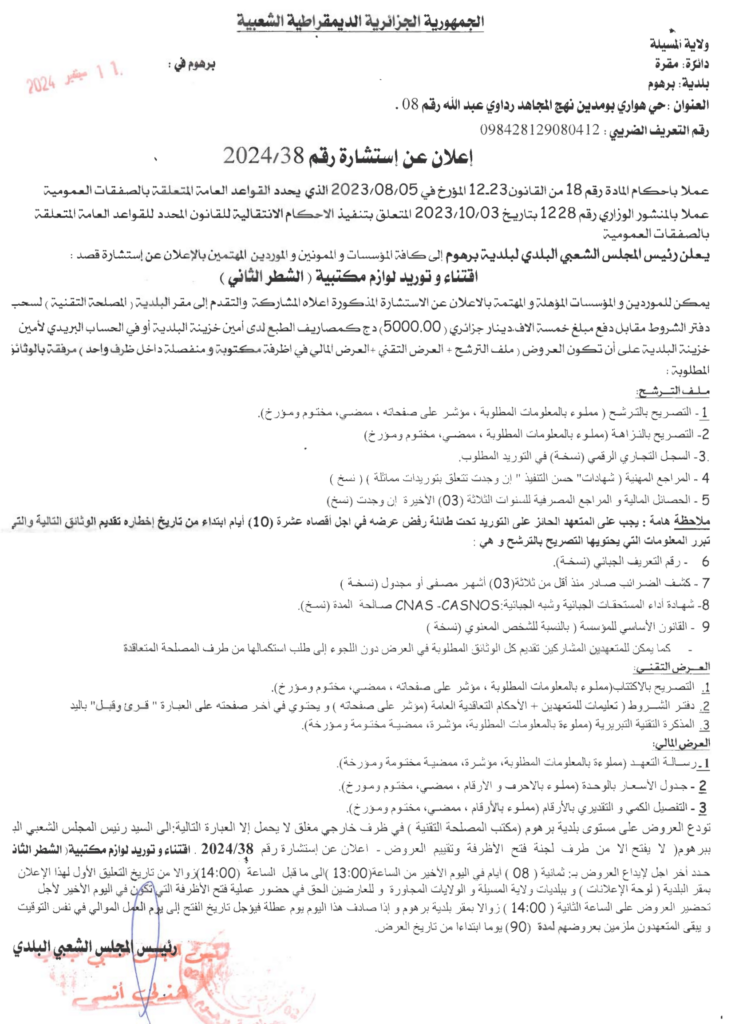 استشارة من أجل: اقتناء وتوريد لوازم مكتبية الشطر الثاني11 سبتمبر، 20240 13 شاركها فيسبوك X مشاركة عبر البريد طباعة