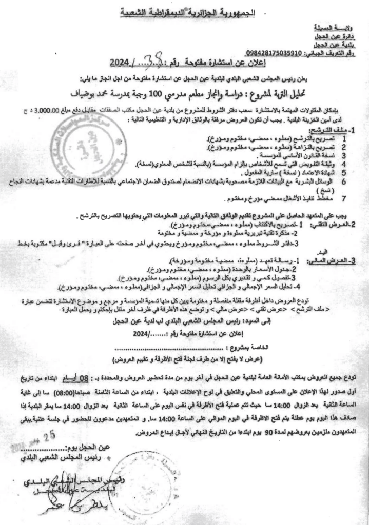 استشارة من أجل انجاز ما يلي: تحليل التربة لمشروع دراسة وانجاز مطعم مدرسي 100 وجبة بمدرسة محمد بوضياف28 نوفمبر، 20240 5 شاركها فيسبوك X مشاركة عبر البريد طباعة