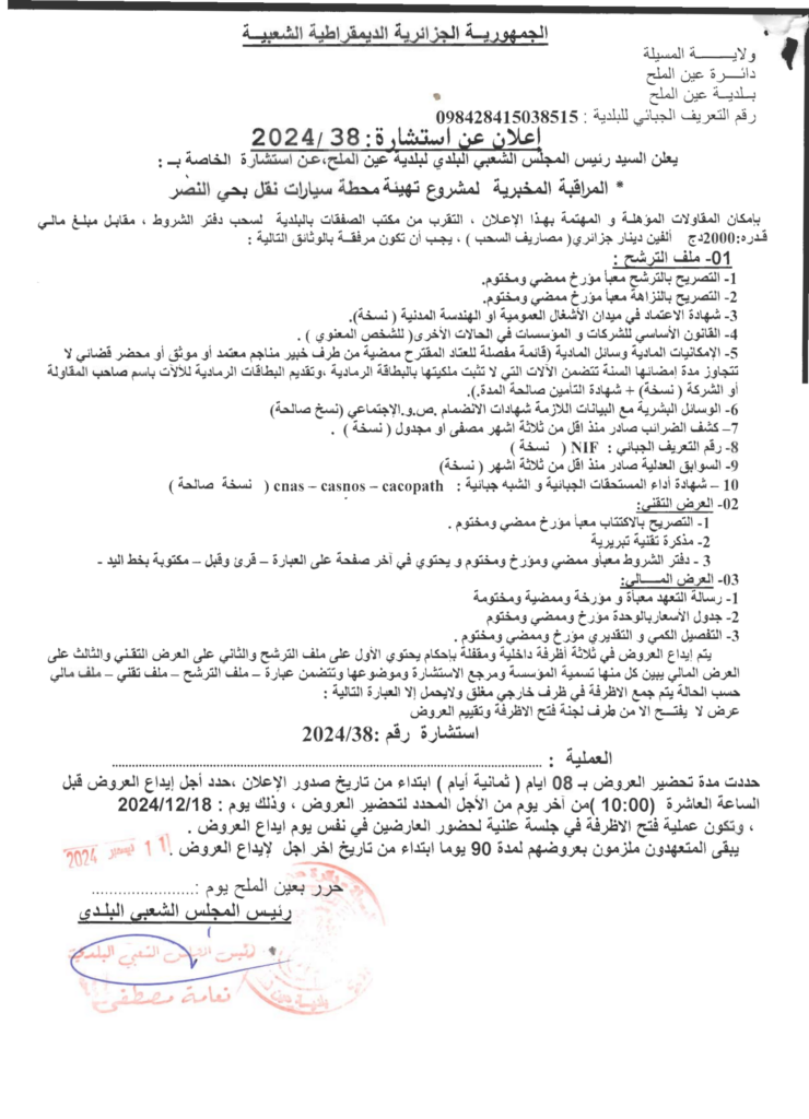 استشارة من أجل: المراقبة المخبرية لمشروع تهيئة محطة سيارات نقل بحي النصر15 ديسمبر، 20240 15 شاركها فيسبوك X مشاركة عبر البريد طباعة