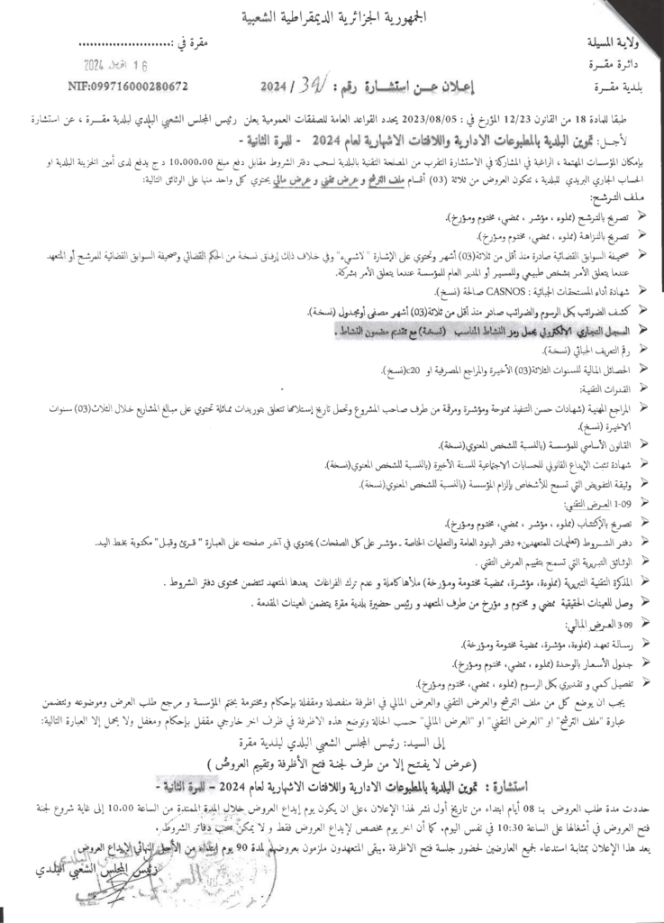 استشارة من أجل: تموين البلدية بالمطبوعات الادارية واللافتات الاشهارية17 أبريل، 20240 40 شاركها فيسبوك X مشاركة عبر البريد طباعة