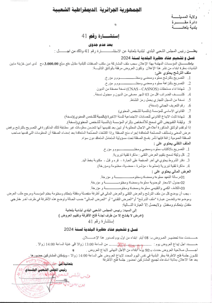 استشارة من أجل: غسل وتشحيم عتاد حظيرة البلدية لسنة 20242 يوليو، 20240 4 شاركها فيسبوك X مشاركة عبر البريد طباعة