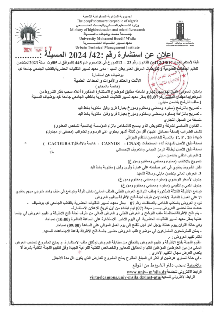 استشارة من أجل: الأثاث والعتاد والمعدات العلمية (خاصة بالمخابر)22 يوليو، 20240 14 شاركها فيسبوك X مشاركة عبر البريد طباعة