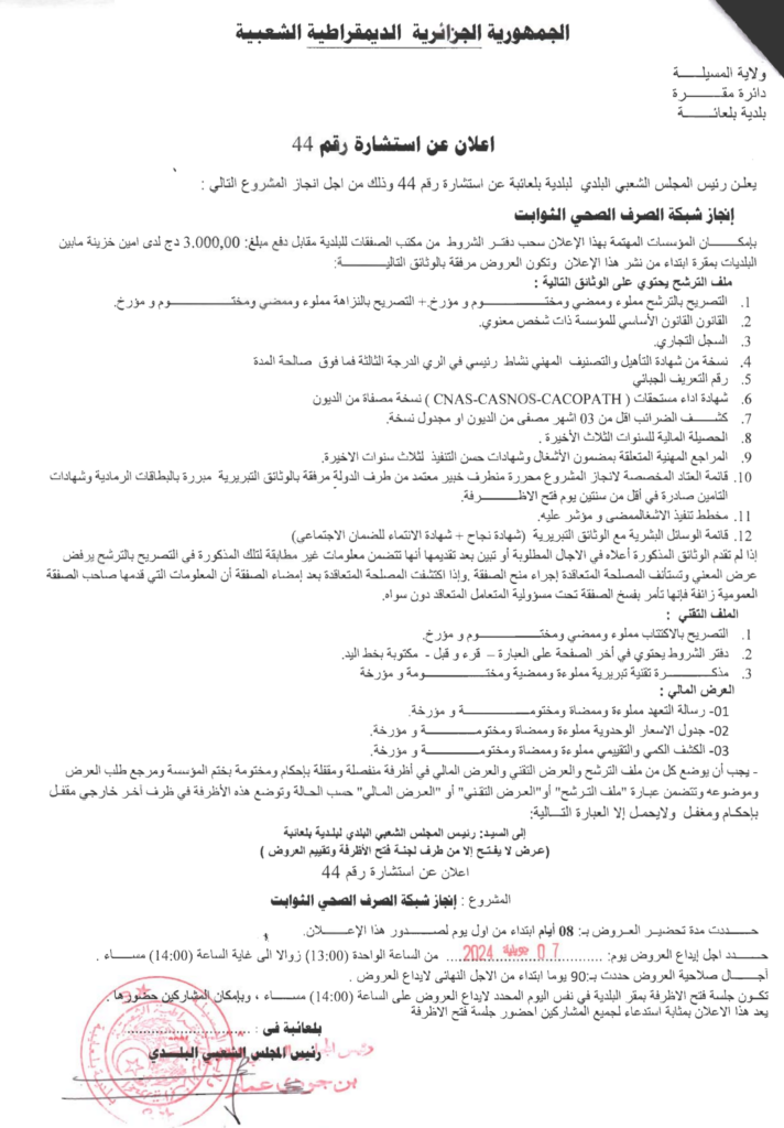 استشارة من أجل: انجاز شبكة الصرف الصحي الثوابت2 يوليو، 20240 7 شاركها فيسبوك X مشاركة عبر البريد طباعة