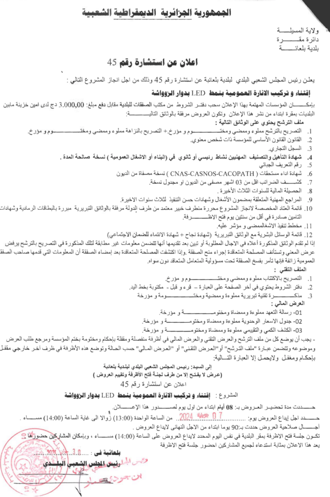 استشارة من أجل: اقتناء وتركيب الانارة العمومية بنمط LED بدوار الزوواشة2 يوليو، 20240 4 شاركها فيسبوك X مشاركة عبر البريد طباعة
