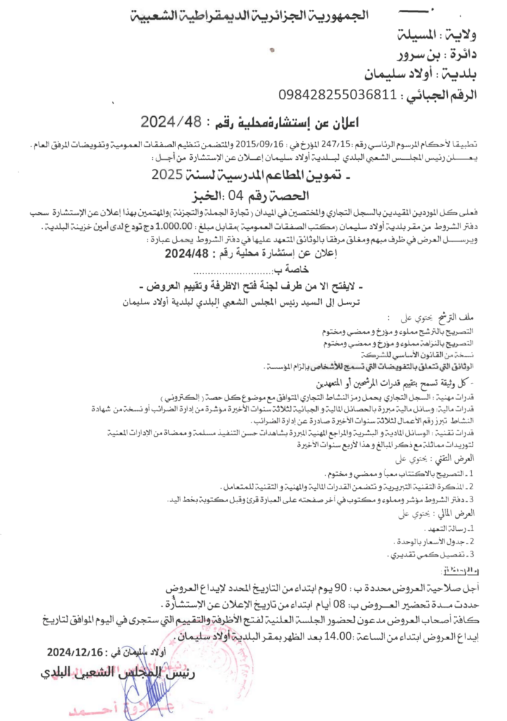 إعلان عن استشارة 2024/48 بلدية أولاد سليمان
