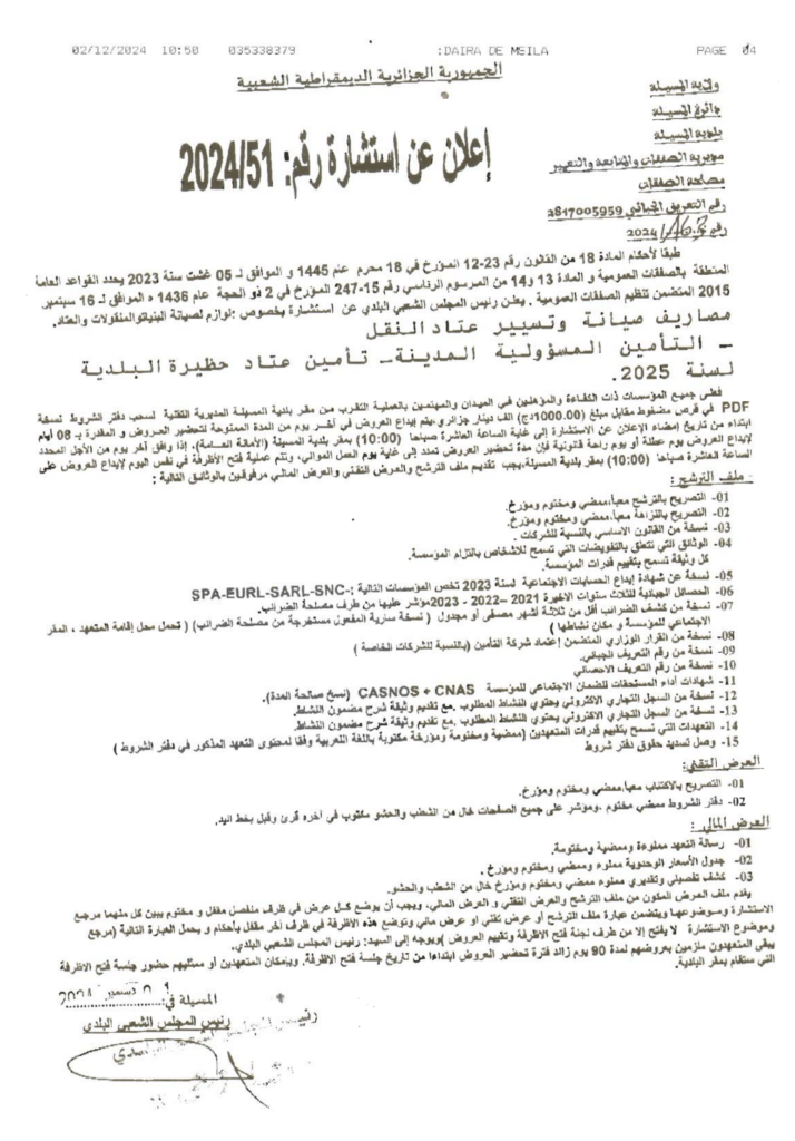 استشارة من أجل: مصاريف صيانة وتسيير عتاد النقل4 ديسمبر، 20240 31 شاركها فيسبوك X مشاركة عبر البريد طباعة