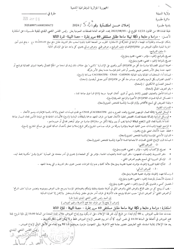 استشارة من أجل: دراسة ومتابعة وتكملة تهيئة ساحة مقابل مستشفى 60 سرير بمقرة -حصة التهيئة- للمرة الثالثة11 يونيو، 20240 32 شاركها فيسبوك X مشاركة عبر البريد طباعة