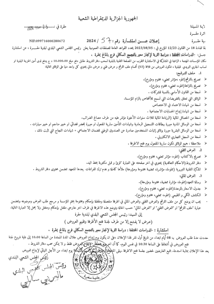 استشارة من أجل: دراسة التربة إنجاز معبر بالتجمع السكاني فرج بالمالح بمقرة28 يوليو، 20240 5 شاركها فيسبوك X مشاركة عبر البريد طباعة