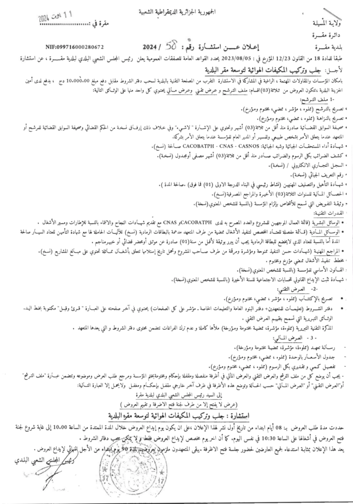استشارة من أجل: جلب وتركيب المكيقات الهوائية لتوسعة مقر البلدية12 أغسطس، 20240 20 شاركها فيسبوك X مشاركة عبر البريد طباعة