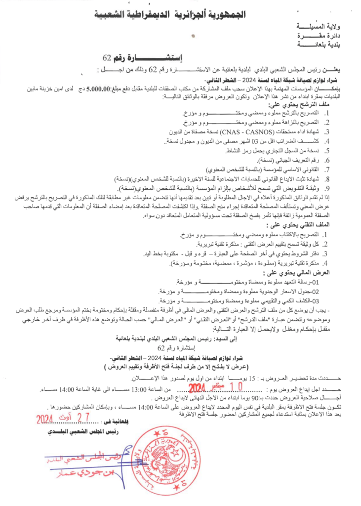 استشارة من أجل: شراء لوازم لصيانة شبكة المياه لسنة 2024 -الشطر الثاني-27 أغسطس، 20240 4 شاركها فيسبوك X مشاركة عبر البريد طباعة