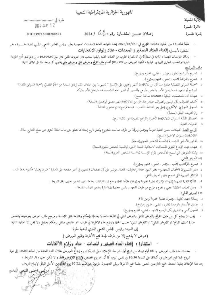 استشارة من أجل: اقتناء العتاد الصغير والمعدات – عتاد ولوازم الانتخابات14 أغسطس، 20240 42 شاركها فيسبوك X مشاركة عبر البريد طباعة