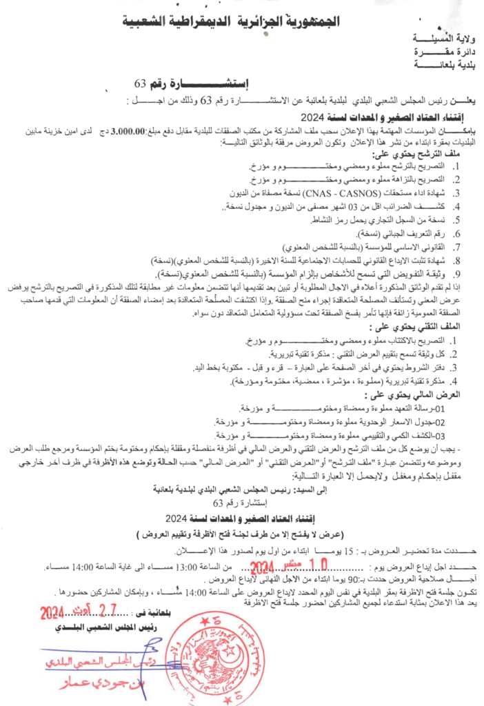 استشارة من أجل: اقتناء العتاد الصغير والمعدات لسنة 202427 أغسطس، 20240 9 شاركها فيسبوك X مشاركة عبر البريد طباعة
