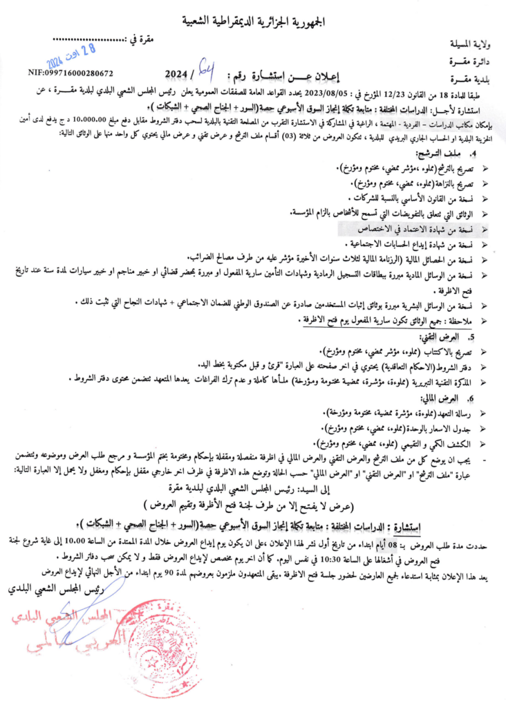 استشارة من أجل: الدراسات المختلفة : متابعة تكملة انجاز السوق الأسبوعي (السور + الجناح الصحي + الشبكات)1 سبتمبر، 20240 17 شاركها فيسبوك X مشاركة عبر البريد طباعة