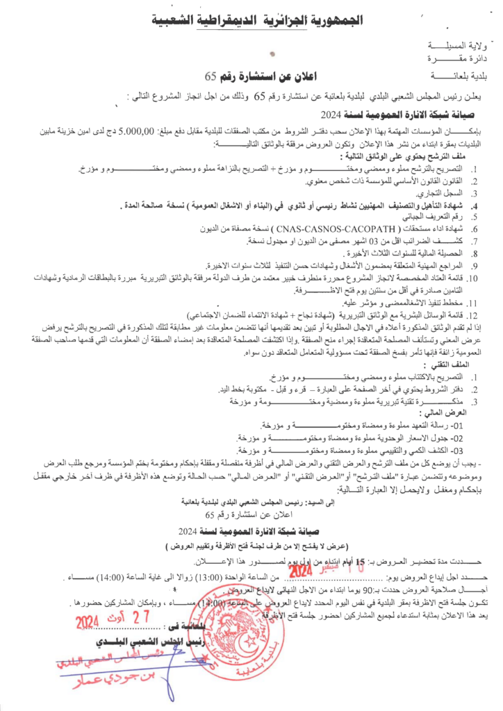 استشارة من أجل: صيانة شبكة الانارة العمومية لسنة 202427 أغسطس، 20240 14 شاركها فيسبوك X مشاركة عبر البريد طباعة